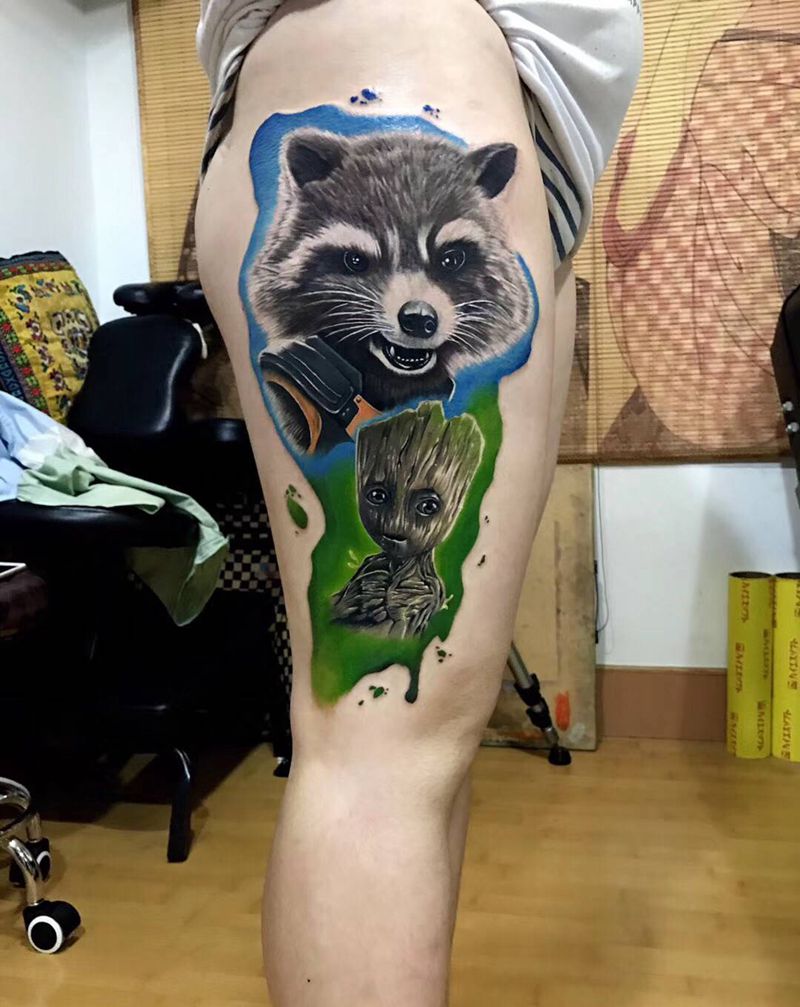 火箭浣熊、小树人格鲁特纹身图片_腿部臀部欧美写实银河护卫队小浣熊格鲁特纹身图案