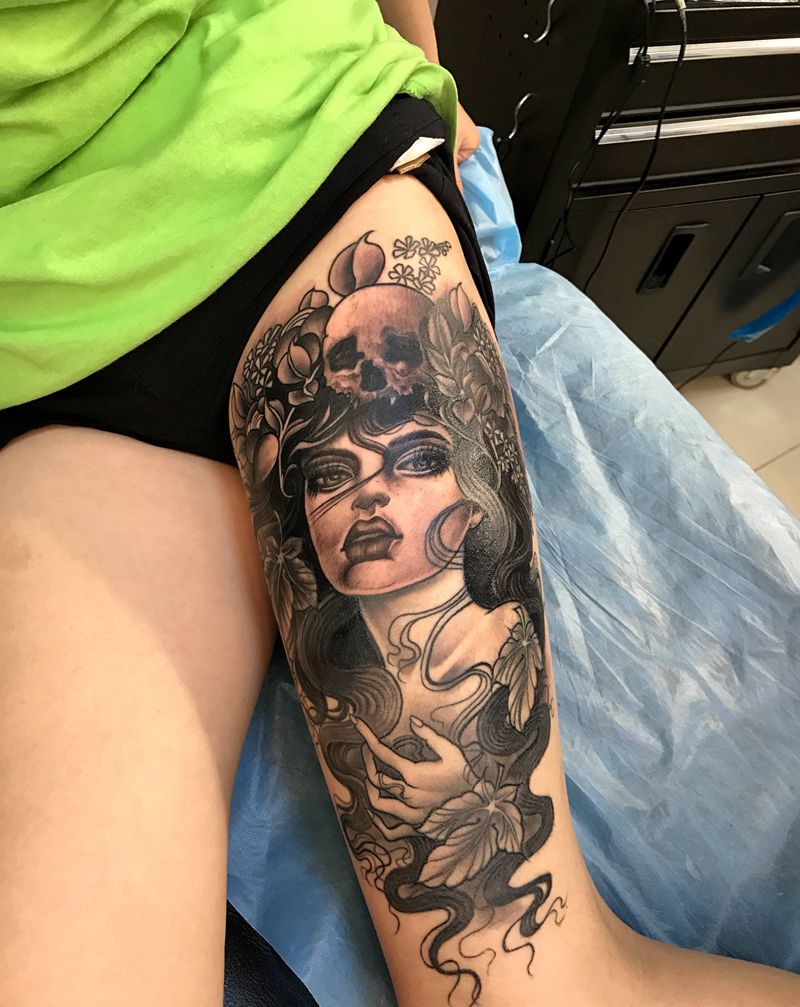 当前位置: 首页 >山东省威海市纹身店-谛听刺青纹身图案>未完待续纹身图片_臀部腿部新传统New School美女女郎人物纹身图案