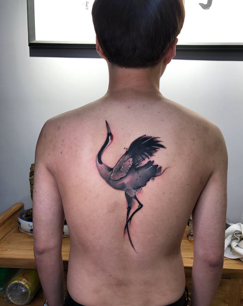 当前位置: 首页 >山东省威海市纹身店-谛听刺青纹身图案>鹤纹身图片_肩部背部水墨仙鹤鹤脊柱纹身图案