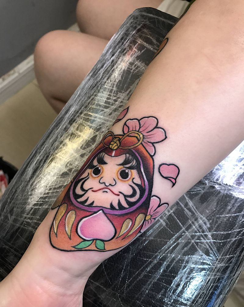 当前位置: 首页 >山东省威海市纹身店-谛听刺青纹身图案>达摩蛋御守纹身图片_手臂手部新传统New School达摩蛋樱花护身符纹身图案