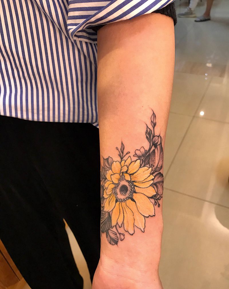 小遮盖纹身图片_手部手臂点刺向日葵太阳花花纹身图案