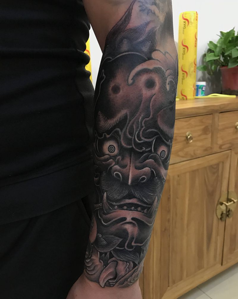 当前位置: 首页 >山东省威海市纹身店-谛听刺青纹身图案>包小臂唐狮子纹身图片_手臂腿部新传统莲花唐狮子荷花纹身图案