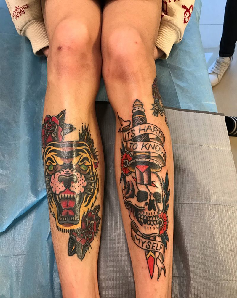 当前位置: 首页 >山东省威海市纹身店-谛听刺青纹身图案>炫酷迎面骨纹身图片_手臂腿部Old School骷髅老虎花纹身图案