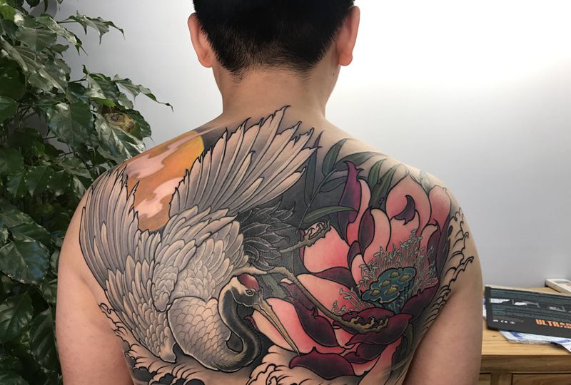 最后扩扩线(彩色恢复后效果)纹身图片_背部肩部新传统鹤仙鹤荷花纹身图案