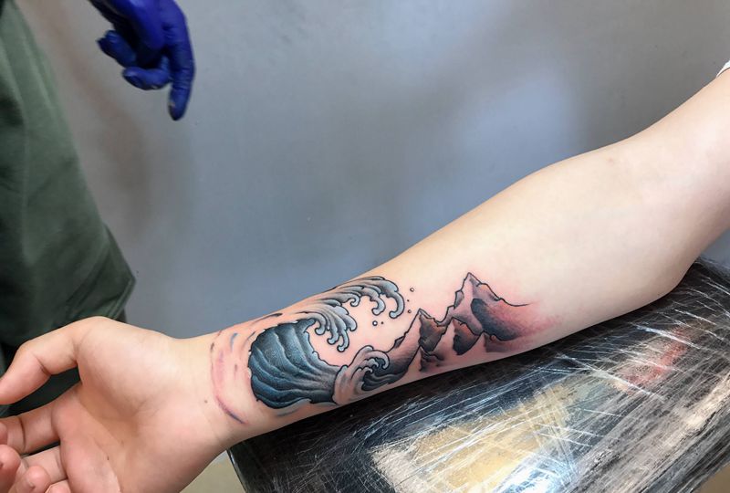 当前位置: 首页 >山东省威海市纹身店-谛听刺青纹身图案>小遮盖纹身图片_手臂手部水彩水墨海浪山山海纹身图案