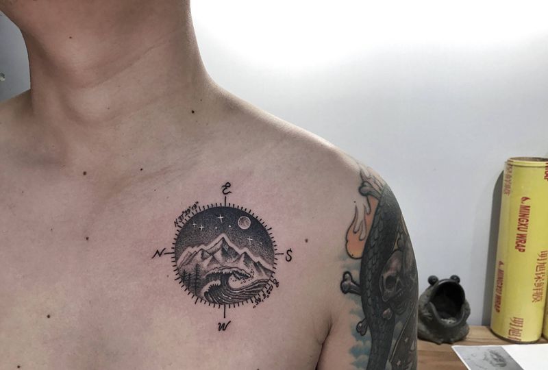 当前位置: 首页 >山东省威海市纹身店-谛听刺青纹身图案>点刺纹身图片_肩部胸部点刺山海指南针树纹身图案