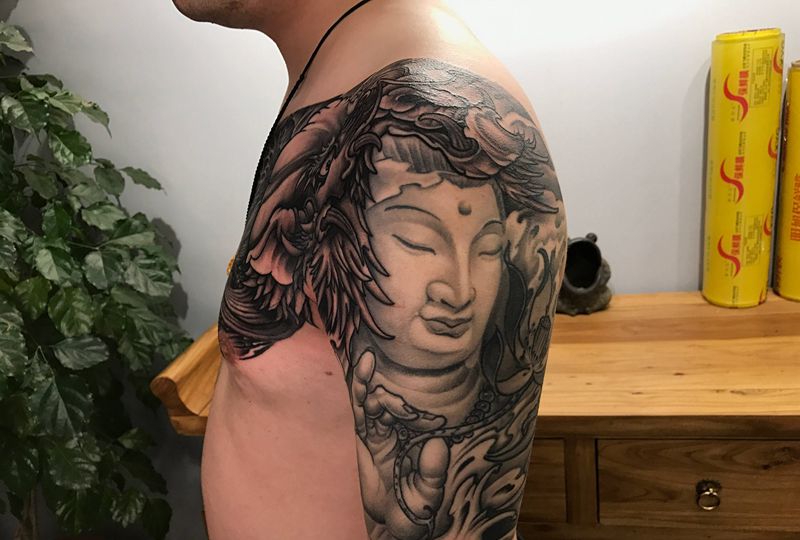 半甲,大臂恢复三年后效果纹身图片_胸部手臂新传统观音龙佛纹身图案