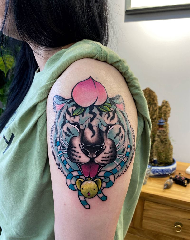 当前位置: 首页 >山东省威海市纹身店-谛听刺青纹身图案>小老虎纹身图片_手臂肩部New School新传统老虎桃子卡通纹身图案