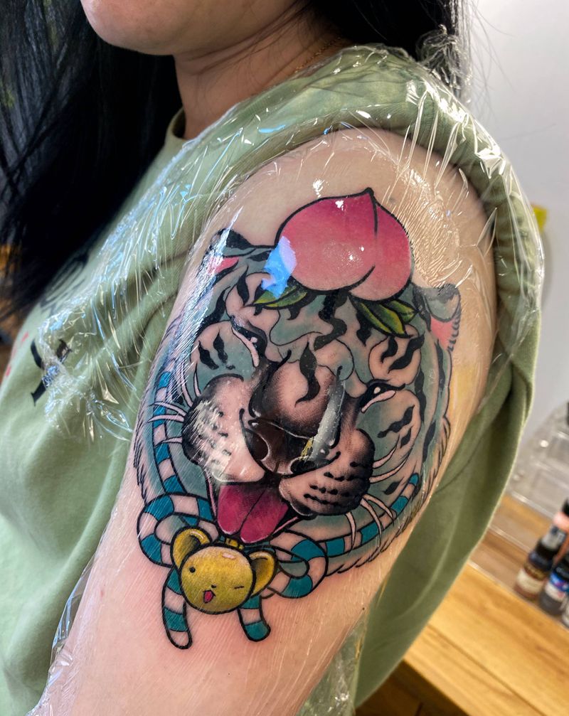 小老虎纹身图片_手臂肩部New School新传统老虎桃子卡通纹身图案