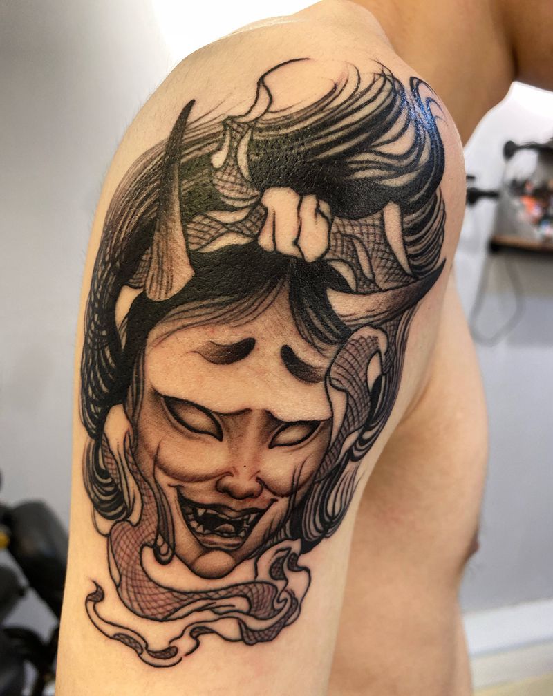 当前位置: 首页 >山东省威海市纹身店-谛听刺青纹身图案>暗黑风般若纹身图片_手臂肩部点刺几何暗黑风格般若小图纹身图案