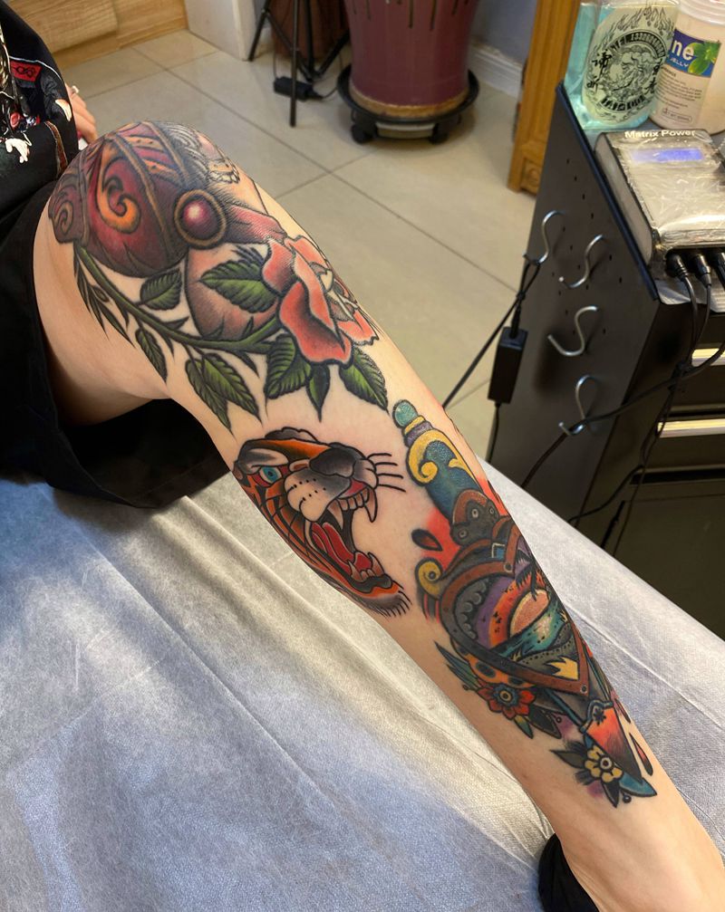 当前位置: 首页 >山东省威海市纹身店-谛听刺青纹身图案>old school拼接纹身图片_腿部脚部老传统Old School老虎虎花腿纹身图案