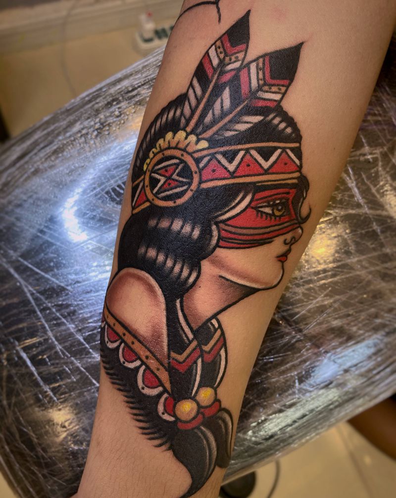 old school纹身图片_手臂手部Old School老传统美女印第安女郎复古纹身图案