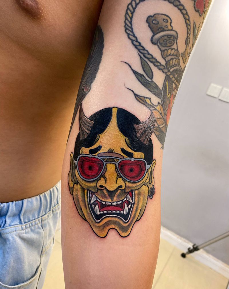 当前位置: 首页 >山东省威海市纹身店-谛听刺青纹身图案>般若纹身图片_手臂手部老传统Old School般若眼镜纹身图案