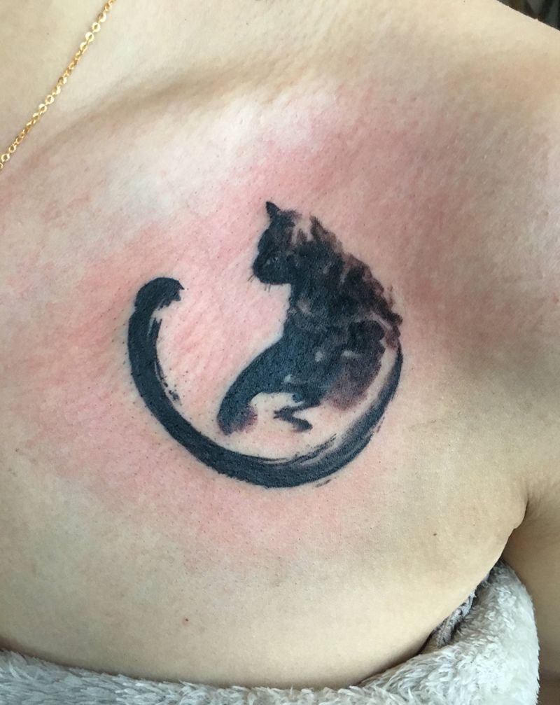 水墨猫纹身图片_胸部水墨猫纹身图案