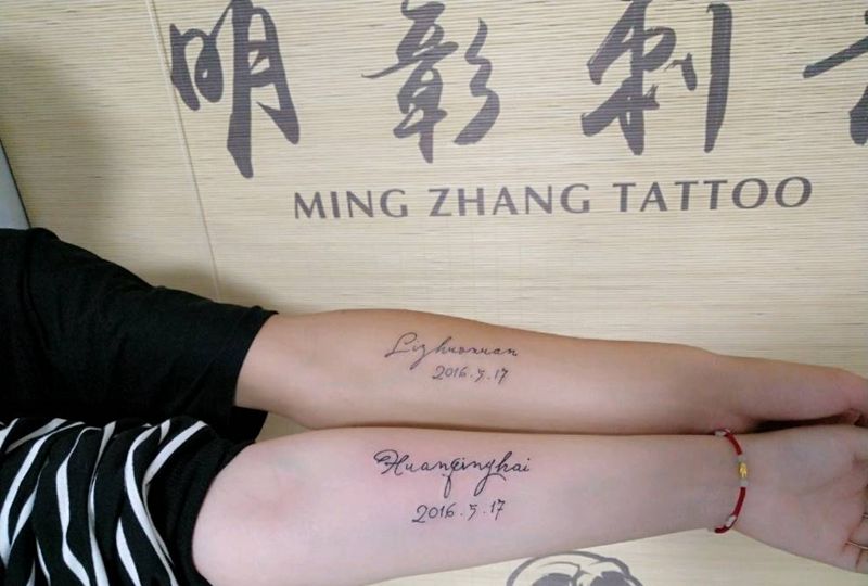 当前位置: 首页 >山东省日照市纹身店-明彰刺青纹身图案>情侣名字纹身图片_手臂花体字纹身图案