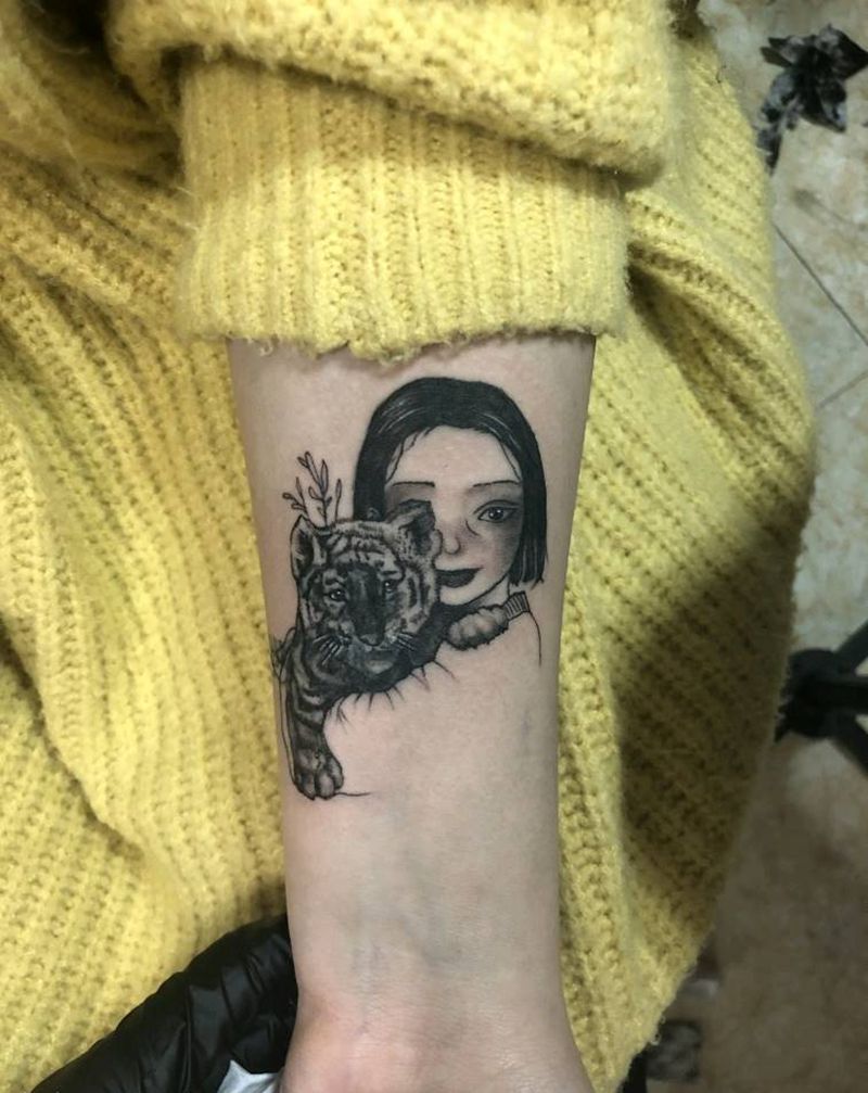 遮盖大脑斧小姑娘纹身图片_手臂欧美写实纹身图案