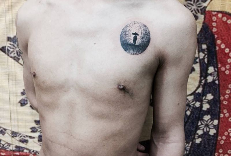 点刺雨中撑伞的人纹身图片_成品胸部清新人物习俗纹身图案