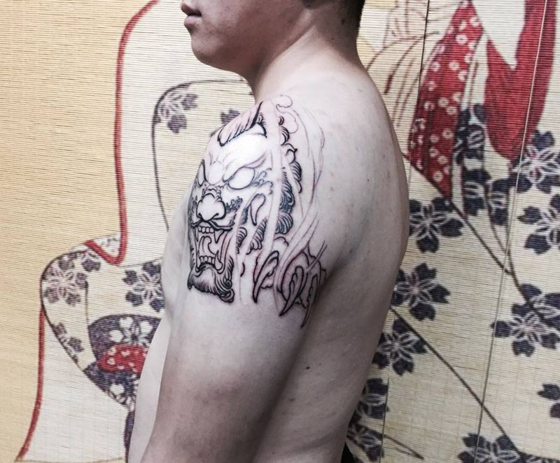 貔貅肩甲纹身图片_成品肩部胸部手臂传统动物鬼神纹身图案