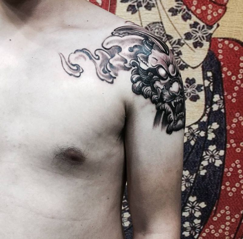 当前位置: 首页 >山东省威海市纹身店-鞭挞刺青纹身图案>肩甲貔貅纹身图片_成品肩部手臂传统动物鬼神纹身图案
