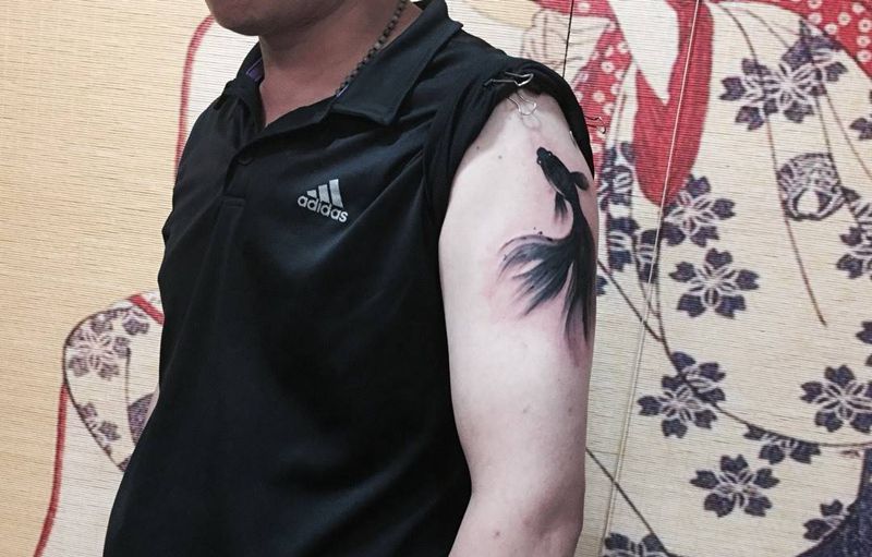 当前位置: 首页 >山东省威海市纹身店-鞭挞刺青纹身图案>客人坚持要做在大臂正面的水墨小金鱼纹身图片_成品手臂传统动物国画纹身图案