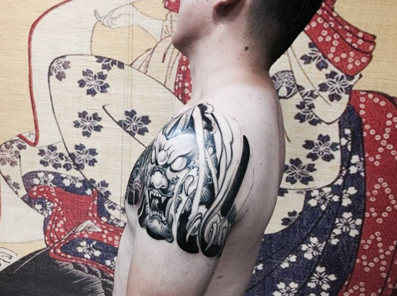 接半甲,待续纹身图片_成品肩部胸部手臂传统动物鬼神纹身图案