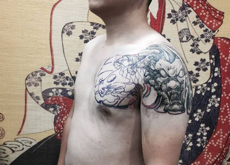 接半甲,待续纹身图片_成品肩部胸部手臂传统动物鬼神纹身图案