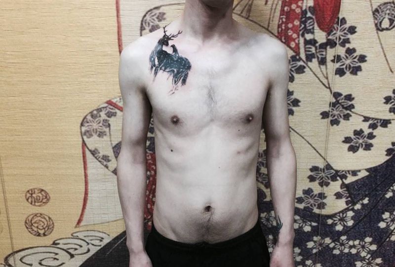 当前位置: 首页 >山东省威海市纹身店-鞭挞刺青纹身图案>一匹鹿的遮盖纹身图片_成品肩部清新习俗动物纹身图案