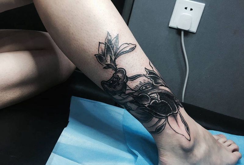 荷花遮盖纹身图片_成品腿部传统植物纹身图案