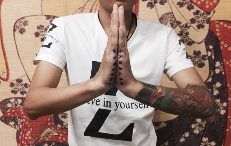 当前位置: 首页 >山东省威海市纹身店-鞭挞刺青纹身图案>手侧纹字纹身图片_成品手部习俗字符纹身图案