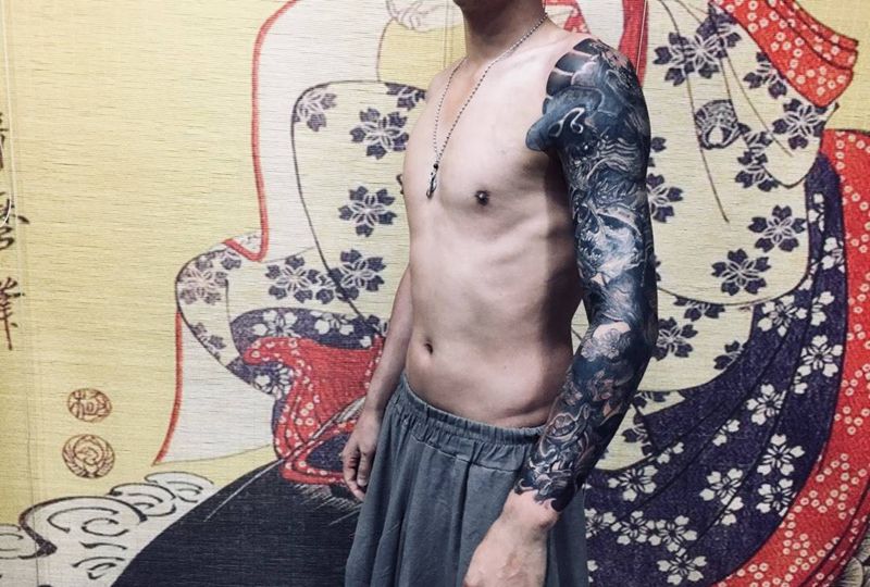 当前位置: 首页 >山东省威海市纹身店-鞭挞刺青纹身图案>大蛇花臂完成纹身图片_手臂老传统蛇鬼武士纹身图案