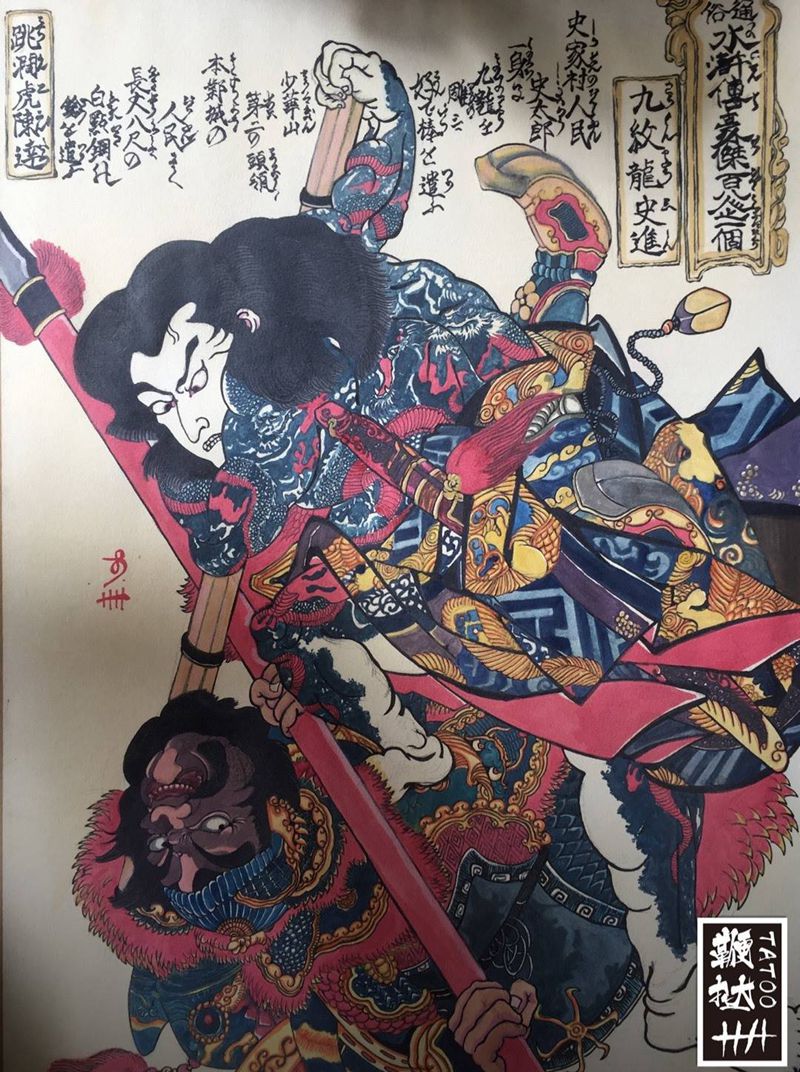 当前位置: 首页 >山东省威海市纹身店-鞭挞刺青纹身图案>九纹龙史进VS跳涧虎陈达纹身图片_背部老传统水浒纹身图案