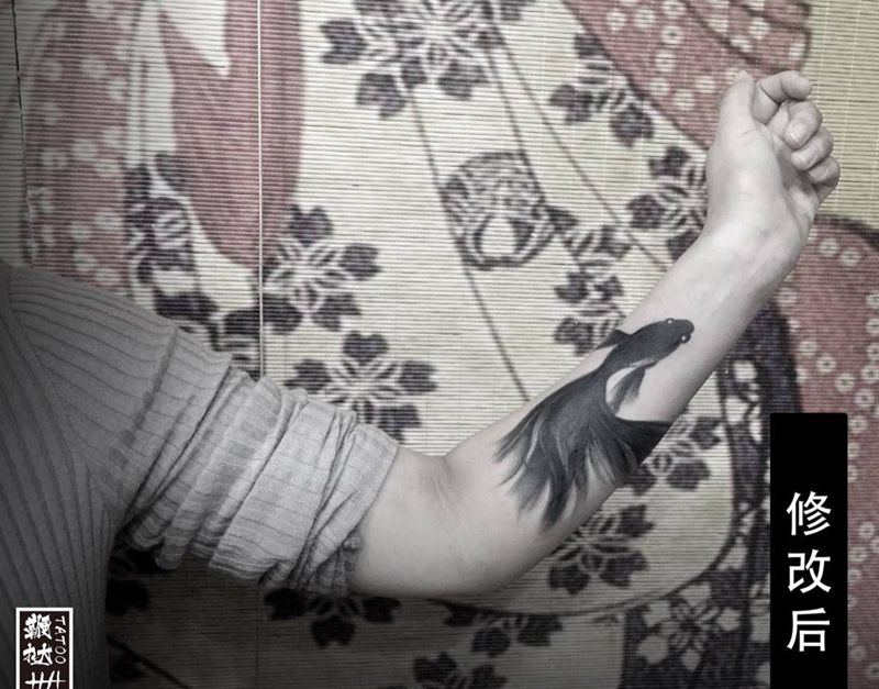 当前位置: 首页 >山东省威海市纹身店-鞭挞刺青纹身图案>黑金鱼遮盖纹身图片