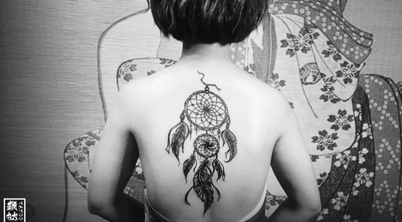 晚上的捕梦网和早上的迷你小字纹身图片_背部新传统捕梦网纹身图案