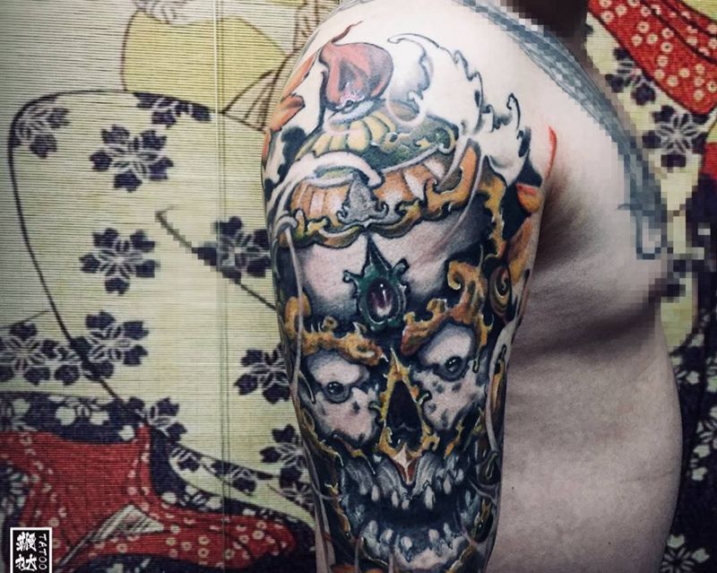 当前位置: 首页 >山东省威海市纹身店-鞭挞刺青纹身图案>嘎巴拉花臂纹身图片_手臂新传统嘎巴拉菊纹身图案
