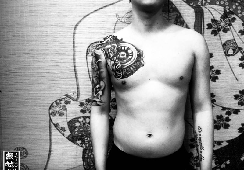 奇卡诺[嘿哈]纹身图片_胸部欧美写实玫瑰钟表纹身图案