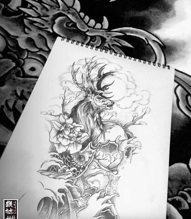 麋鹿&鲤鱼旗纹身图片_腿部新传统麋鹿鲤鱼旗纹身图案