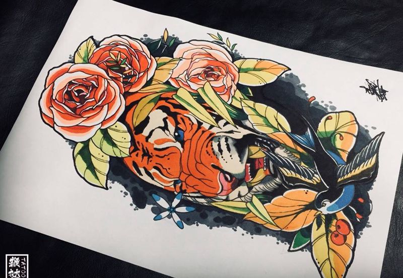私人订制,老虎小腿~[嘿哈]纹身图片_腿部New School虎蔷薇燕子纹身图案