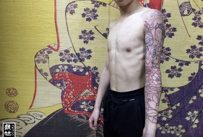 当前位置: 首页 >山东省威海市纹身店-鞭挞刺青纹身图案>菩萨臂走线完成~纹身图片