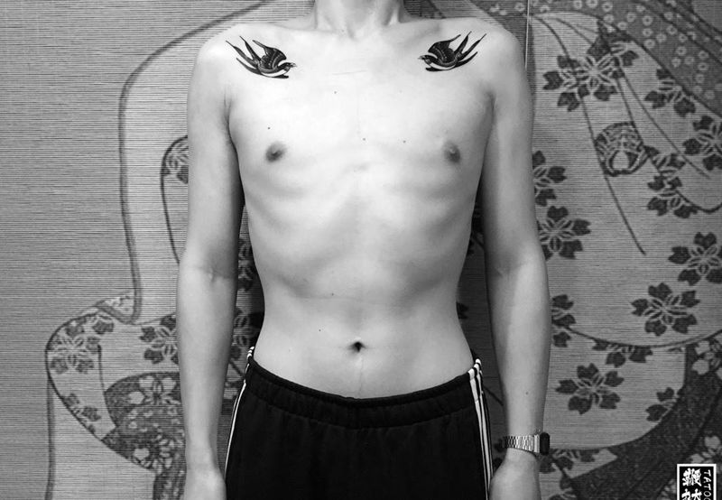 当前位置: 首页 >山东省威海市纹身店-鞭挞刺青纹身图案>双肩燕纹身图片_肩部Old School燕子纹身图案