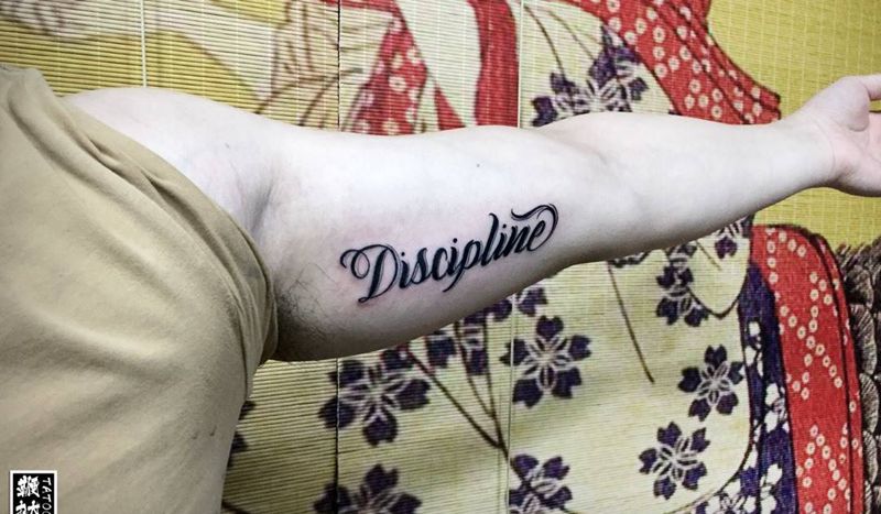 当前位置: 首页 >山东省威海市纹身店-鞭挞刺青纹身图案>Discipline纹身图片_手臂花体字纹身图案