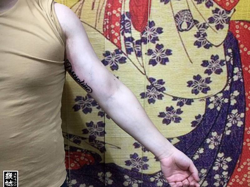 当前位置: 首页 >山东省威海市纹身店-鞭挞刺青纹身图案>Discipline纹身图片_手臂花体字纹身图案