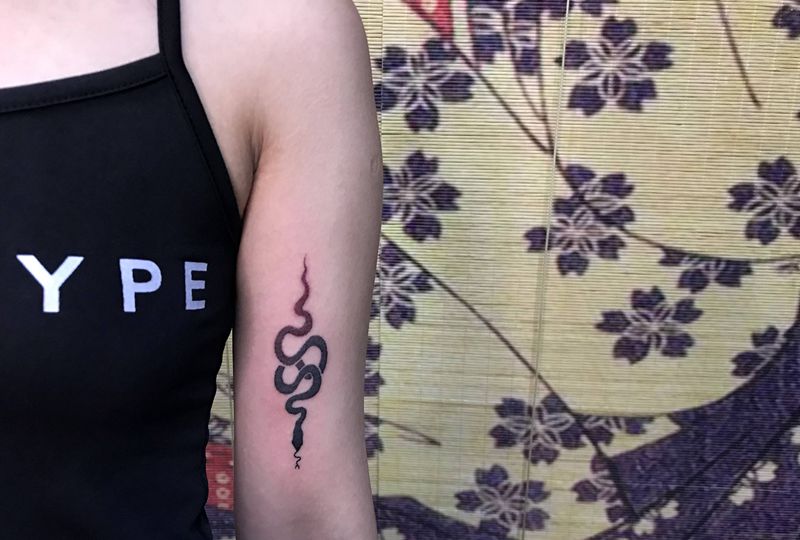 当前位置: 首页 >山东省威海市纹身店-鞭挞刺青纹身图案>一条小蛇,圆三点刺。纹身图片_手臂点刺蛇纹身图案