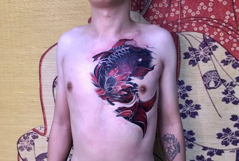 胸口大鱼盖小鱼,完成~纹身图片_胸部新传统鲤鱼纹身图案