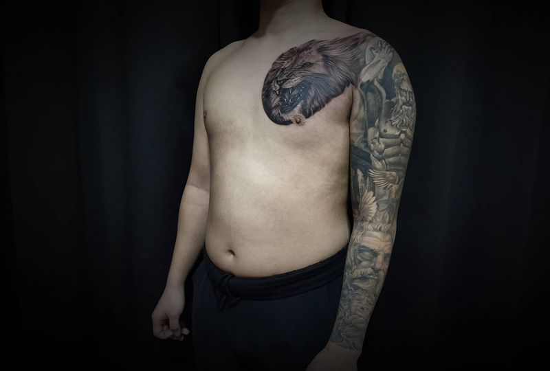 左胸狮子纹身图片_胸部手臂欧美写实纹身图案