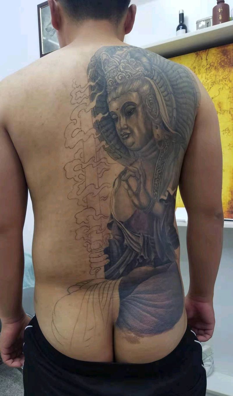 虚空藏菩萨纹身图片_背部水墨欧美写实纹身图案