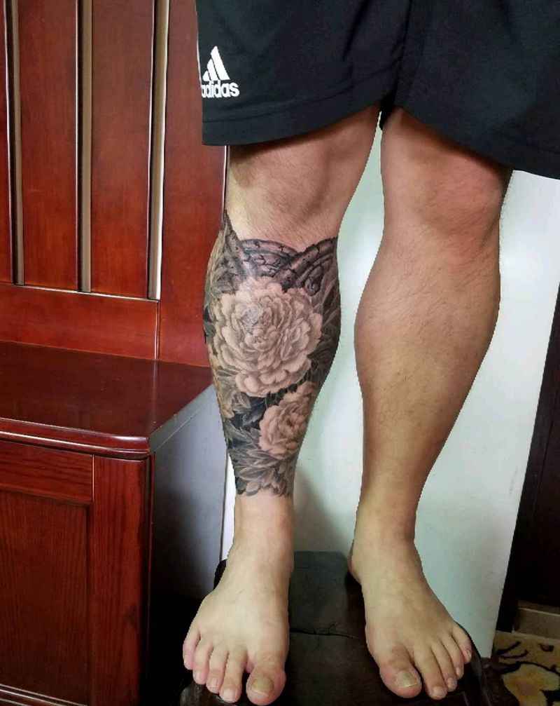 牡丹蛇纹身图片_脚部腿部欧美写实浮雕纹身图案
