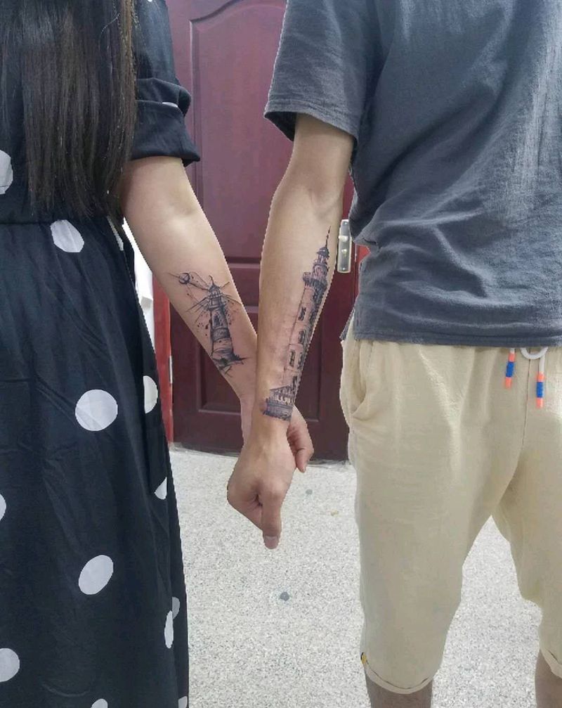 情侣纹身,灯塔纹身图片_手臂水墨欧美写实纹身图案
