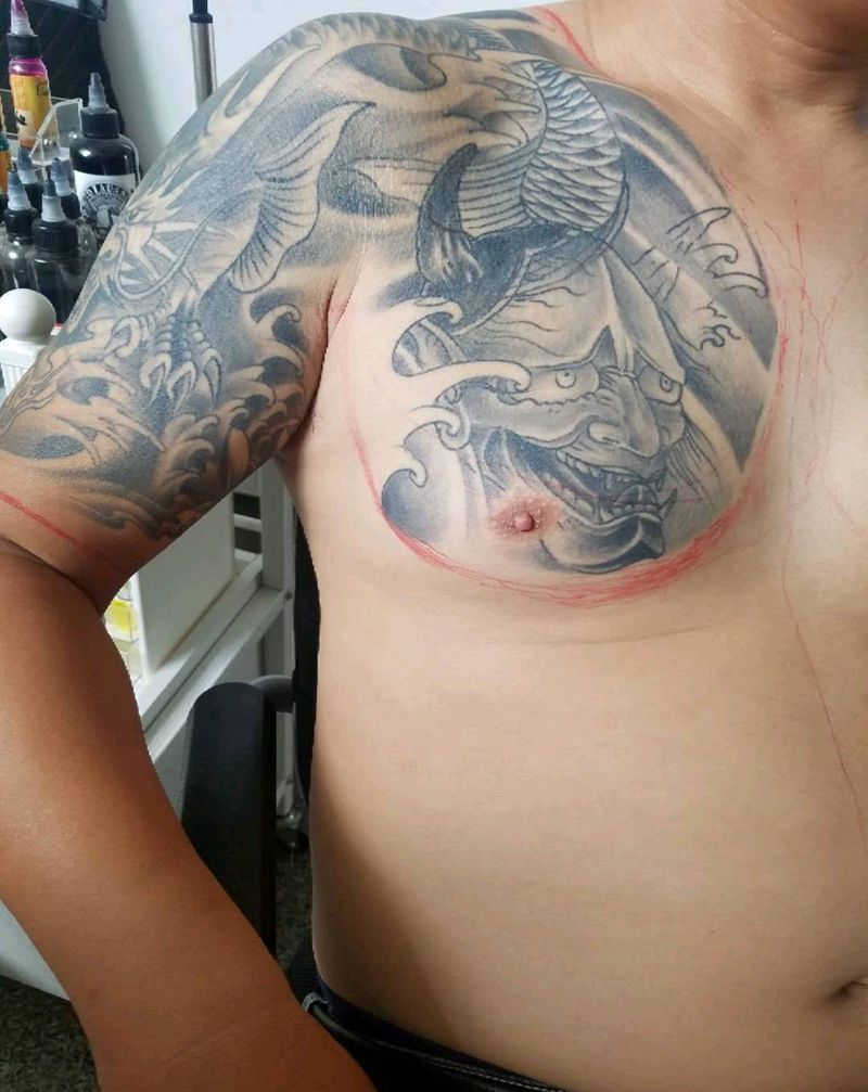 半甲纹身图片_肩部胸部新传统修改补色纹身图案