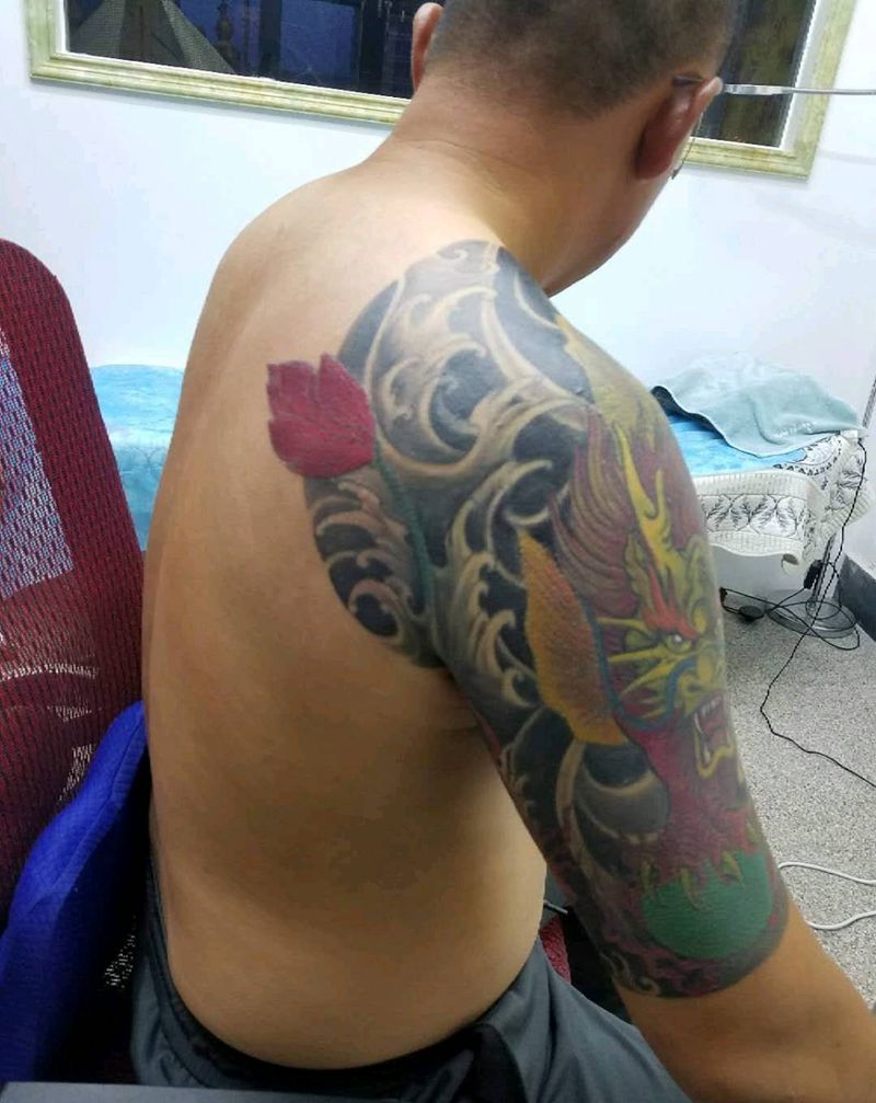 半甲纹身图片_肩部胸部新传统修改补色纹身图案