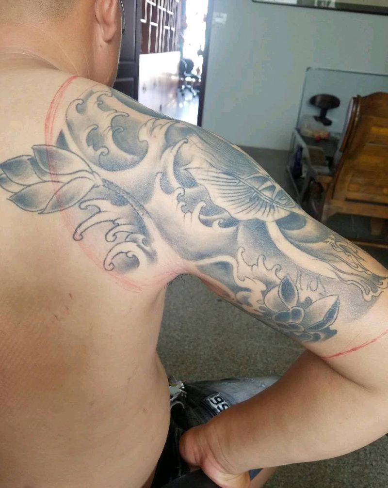 半甲纹身图片_肩部胸部新传统修改补色纹身图案